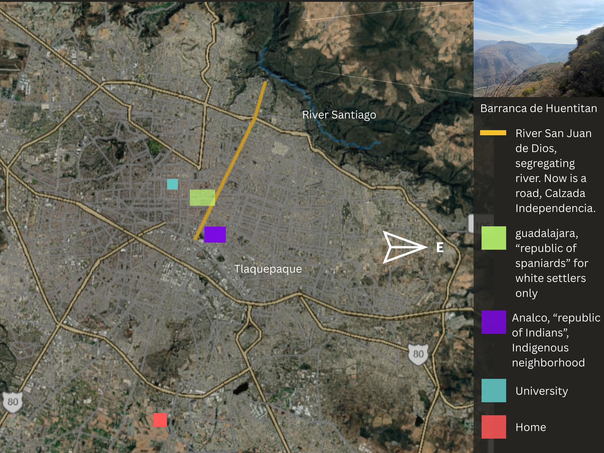 The city was designed and built to racially segregate people since its colonial inception, using a river as delimitator that placed Indigenous Peoples on it’s east side and white settlers at west. This segregation was made a politic public and legalized by the spaniards who mandated Indigenous Peoples to live in designated concentrated areas far from the city center. These concentrated areas called “Indians Republics” were isolated, disconnected and not part of guadalajara, guadalajara was just where the settlers lived. Analco was the first Indigenous Peoples neighborhood in colonial guadalajara. Transportation from the Indians Republics to guadalajara was incredibly hard and long making it inaccessible (see map below).